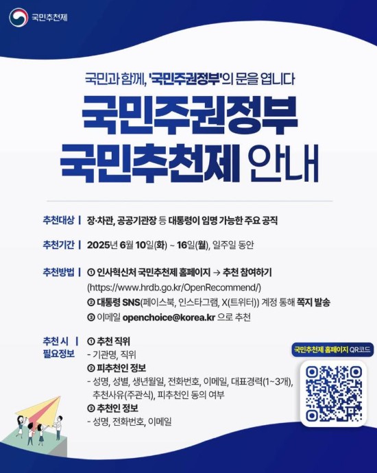 ๊ตญ๋ฏผ์ถ์ฒ์ ๋ ๋ํต๋ น์ด ์๋ช ํ๋ ๊ณ ์๊ณต์ง์ ํ๋ณด๋ฅผ ๊ตญ๋ฏผ์ด ์ง์ ์ถ์ฒํ ์ ์๋๋ก ๋ง๋ ์ ๋์ ๋๋ค.